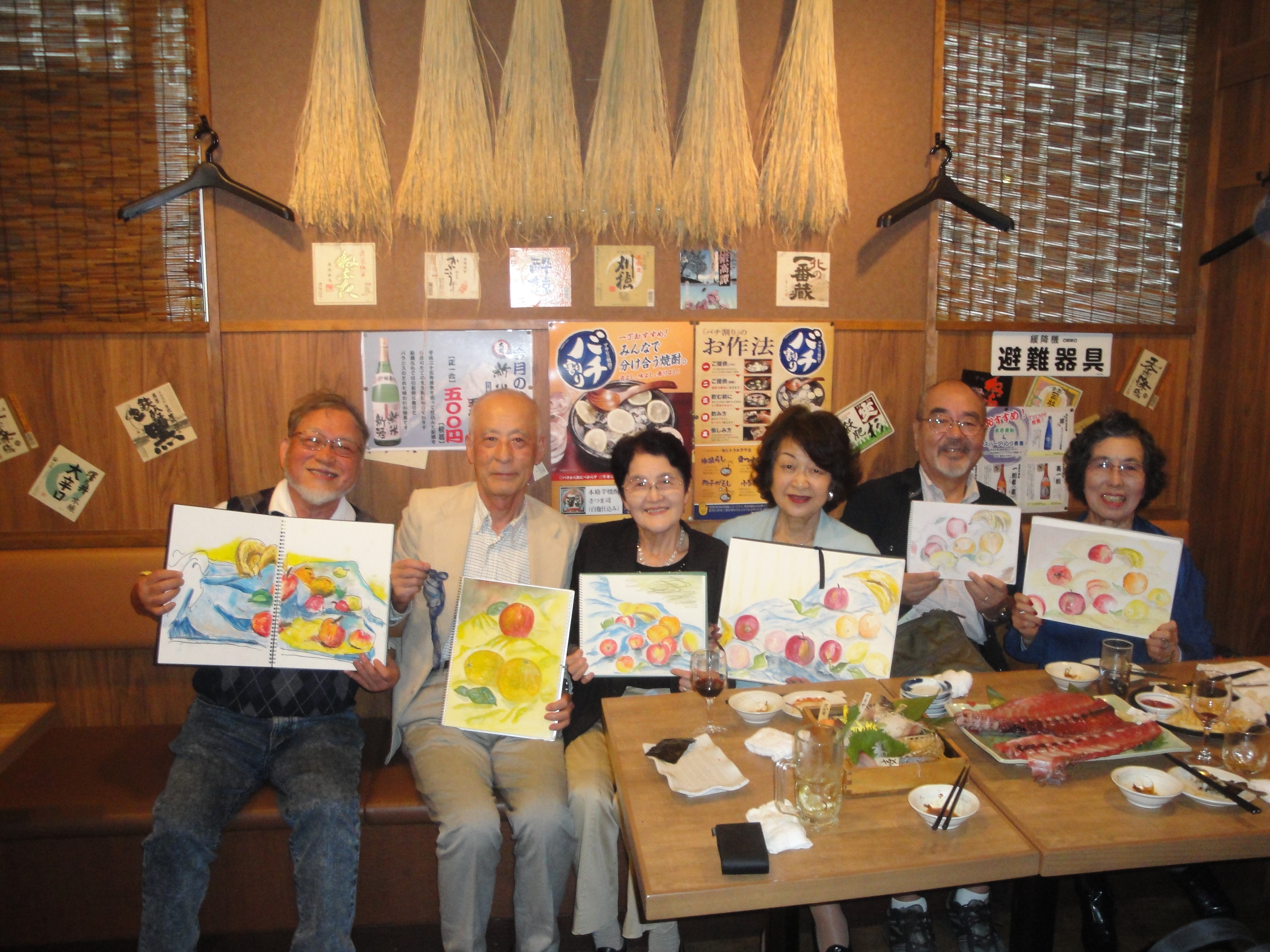 モチーフは「居酒屋」らしく、どれも「酒」に関わるものばかり。いろいろな清酒の一升瓶が並ぶ酒棚、酒のれん、天井に貼られた金運お札、写生をしている仲間を写生、などなど、とてもユニークなものばかりでした。居酒屋の2階を借り切ってスケッチ会をしたことは過去の記憶にありません。とても思い出に残るユニークな第1回目のサロンになりました。