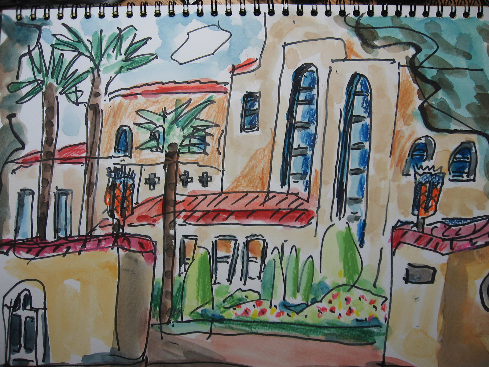 午後2時から5時まで屋外で白亜の建物を色々な角度からそれぞれの個性で写生しました。喜田さんが一人ずつ、丁寧にポイントをアドバイスしてくれました。.