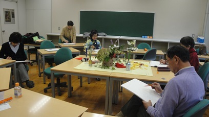 遠矢さんが庭に咲いている色々な花を摘んできてくださいました。また、紅茶の缶とか蝋燭立などのしゃれた静物も揃えてくれました。 今回は午後1時から午後5時までの4時間という長い時間をかけて、それぞれ個性的な作品を仕上げました。