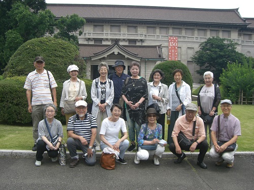 新型コロナによる感染者の減少が続きマスクも外せるようになりましたが、まだ安心できる状態ではないので、静かに見学できる国立博物館にしました。 上野駅公園口に11時、14名の方が元気に集合しました。目の前左右には東京文化会館、西洋美術館があり、公園内を歩いて右手の国立科学博物館を過ぎると10分ほどで国立博物館に到着しました。先ずは集合写真、準備しているとたぶん特別展見学の人でしょう『お撮りしましょうか』と先に言われ良い人です。