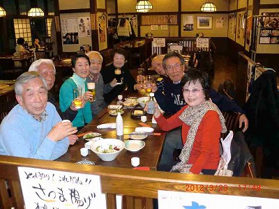 ●第73回 平成24年10月22日(月) 参加者 12名 秋晴れの気持ちのいい日、12名がJR横須賀駅に12時半に集合。 青くて綺麗な海を眺め、鯨がいる!と言われてよく見たら潜水艦。普段見る事のない空母など軍艦が何隻も並んでいるのは壮観。 近くのホテルの レストランで「海軍カレー」に舌鼓を打つ。そこから15分ほどを横須賀 らしい雰囲気の商店街を歩き「記念館三笠」に到着。シニア400円。三笠の中が記念館になっていて、日露戦争のビデオを見て、解説などを聞き、艦内を歩きまわる。 当時の男性(海軍の軍人や政治家)の顔はみんなしまっていい顔をしていると女性陣の声。平和ボケって怖い。 3時半ころ、帰途に。京急汐入近くのサイデリアで打ちあげ。 いろいろあったけど、楽しんでいただけたようでよかった。企画してくださった、有川さんありがとうございました。 ![]() ![]() ●第72回 平成24年9月25日(火) 参加者 12名 12時半、渋谷ハチ公前に11名集合。12時41分「スタジオパーク」行きのバスに乗り5分ほどで着く. 2時頃、社員食堂でそれぞれ好きなものを頂き安くて美味しいと舌鼓を ●第71回 平成24年8月20日(月) 参加者11名 日だまり70回記念旅行に11名が参加して、軽井沢に 1泊旅行をする。 河端さまご夫妻の綿密な計画により楽しい旅を満喫した。費用もいろいろ検討してくださり ジャンボタクシーと普通のタクシーを2時間契約して、白糸の滝・旧三笠会館・聖パウロ教会・碓氷峠見晴らし台・鳩山別邸・雲場池・鹿島の森ホテル。車窓から見るところ、歩いて行くところ、至れり尽くせりで、最後の鹿島ホテルでは、70回を記念して豪華なランチ、そして君塚さんのバースデイ○○歳をお祝いしてホテルの心温まるデザート、みんなで「ハッピーバースディ」を歌い, 2時40分くらいの列車で、帰途につく。 思えばよくも70回を迎える事が出来た。参加してくださるみなさま、協力してくださる方々 に支えられての70回だとこころからの感謝を捧げる。 ![]() ![]() ![]() 白糸の滝の前で 白糸の滝 妙義山 ●第70回 平成24年7月20日(金) 参加者15名 東京湾クルーズ&宏子の歌声喫茶 15名参加 市川さん企画に相乗りさせて頂いて、「東京港クルーズと宏子の歌声喫茶」に参加。竹橋埠頭の新東京丸乗船場を10時に出港。馴れた説明してくださる方の話を聞きながら、右や左の景色を眺め、湾内の説明を聞く。ごみ問題、輸入、輸出問題、知らない事がいっぱいあって、こういうお仕事に携わって日本を支えているんだと感動する。 1時間半で竹橋埠頭へ戻り、時間調節をしてアジュール竹芝 21階 フレンチレストランへ 12時半からお食事、赤ワインなど飲みながら談笑のひと時。1時半から「宏子さんと歌う」 リクエスト曲を15曲ほど、歌に癒されて3時散会。 ●第69回 平成24年6月18日(月)1時15分、12名集合。皇居見学 他の参観者100名ほど。宮内庁の職員の方に引率されて、休所で注意とビデオを見て ぞろぞろと、案内の職員の方の説明を聞きながら1時間余梅雨の晴れ間みどりが綺麗。 春はさくら、秋は紅葉がきれいとのこと。庶民の生活音は何も聞こえない何とも静寂な世界。 ![]() 3時前に解散となる。有楽町まで歩く人9名タクシーの人 3名。ニュートーキョーで喉を潤し、まだ明るい5時過ぎ散会。 こういうことでもないと皇居の中を説明して いただけないのでいい体験をした。 ![]() ●第68回 平成24年5月22日 JFE川崎工場見学 13名小雨降る中、日だまり7名JFEOBの方6名が川崎駅改札に 集合 1時半の迎えのバスで30分、工場内のホールで説明を聞きビデオを見てから作業衣に 着替えて、バスで高炉・転炉・厚板工場と鉄の階段を3階まで3回登り降りしたら、足に堪えた。鉄を巻きとるまでの工程は圧巻。説明してくれた方のお話が楽しくてよく笑う。 5時近く、玄関前で記念写真を撮って、バスで帰る3人の方を駅まで送っていただき、そのまま、「鋼友会館」へ。和風の料理屋さんと言う感じ。靴は脱いだけど、椅子席だった。 会費でもめたので、心配したけれど、結構なお料理で飲み放題。OBの方たちの話も弾んで7時過ぎ散会。余りにひどい雨なので、小やみになるまでお茶の接待あり。 居酒屋との違いを感じた。小雨の中、駅まで大分歩いてびしょびしょ。 駅でお別れして帰宅。 ![]() ●第67回 平成24年4月20日(金) 参加者13名 13時45分集合なので35分頃、東西線地下鉄の出口へ行ったらもう3人いらしてた。日だまり仲間は、遅刻なし。 説明の女性がついてくれて、適切な質問が出て、よかった。1時間くらいだったか、あと自由に 「気象科学館」で、津波の実験や映像で地震のいろいろを見たり・・・ 3時からパソナというビルで清浄野菜を作っているのを見学。そこから東京駅八重洲まで歩き。 東京駅の中を歩き回ってやっと、予約してある「ニュートウキョー」をみつける。 呑めない私でもビールの美味しかった事!まだ明るい6時過ぎ、散会。お疲れ様。 7千歩近く歩いた。 気象庁前の桜がきれいだった。 ![]() ●第66回 平成24年3月23日(金) 参加者8名 3月23