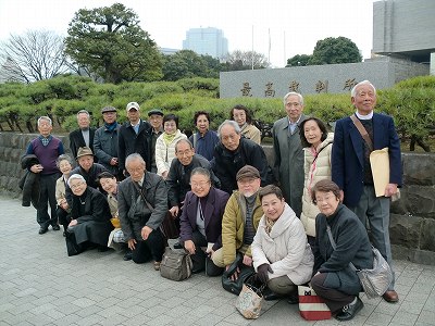 3月16日(月)22名が地下鉄半蔵門駅1番出口に集合。5分ほど歩いて最高裁判所に着く。茨城県の稲田石で築かれた荘厳な建物。中に入って大きな劇場のようなホールでDVDを15分ほど見て、最高裁判所の建物の歴史、仕事の内容などを学ぶ。