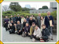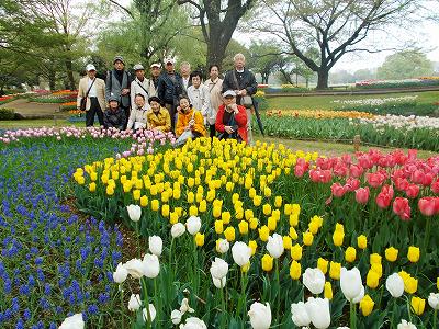 4月20日(月) 予報では午後から雨風強くなると出ていたけれど、日だまりは雨にもめげず15 名が1時半に西立川駅に集合。全員シルバー料金で入場。パークトレインで1周する予定だったけど、チューリップ広場で降りて、色とりどりのチューリップに感嘆の声をあげ、これから咲き乱れるポピーの広場を見てから、日本庭園へ。ここは盆栽が飾られてあり、100年もの年月をかけて形よく育てられた松や楓を観賞。 丁度説明してくれる方がいらして、育て方の苦労を伺う。そこから出口まで歩く予定だったけど、パークトレインに乗ろうの声が上がり、西立川口まで乗って公園をあとに、立川まで出て、和民で二次会。予報が半分あたって帰りは風が強くなり雨も降り始めて中央線、南武線それぞれに別れて帰る。