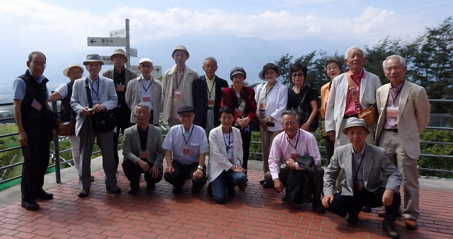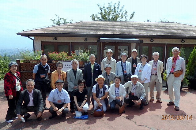 台風の通り過ぎた暑くもなく寒くもない日になって、9時、新宿駅10番線ホームに13人集合。空いていて向かい合わせの席をあちらこちらに作る。三鷹で二人八王子で三人が乗車。18名、一人も欠けることなく揃う。おしゃべりしていたら1時間半はあっという間だった。石和温泉で下車。富士野屋夕亭からの迎えのマイクロバスが来ていて途中道路では珍しいスイッチバックを経由して坂道を登る。開園から100年余年の林さん