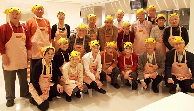 番号順に並んで3階の「チキンラーメンファクトリー」へ。指定された席に、エプロンと三角巾が置いてあり、それぞれに身につける。説明を聞いて、ビデオを見て、番号順に6名づつテーブルにつく。