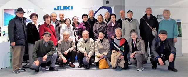 足踏みミシンを見た女性は懐かしそう。家庭用ミシンも自動化されていて、小さい袋を作る体験をする。模様を選んで、教えられたとおりに動かすと、模様が縫える。縫い始め縫い終わりの往復も自動で、糸切りもボタン一つ。使ったことのない男性も恐る々動かして、 紐を通して巾着袋の出来上がり。「ミシンが欲しくなった!」という声があがる。設定さえすれば、ボタンつけやボタンホールなど自動で出来る。工業用ミシンもワイシャツの5つのボタン穴をいっぺんにあけるとかジーンズのズボンのポケットもポケットの布を乗せるだけで、自動で縫い付ける・・・最後に「電子部品実装機」というスマートフォンや電化製品、エレクトロニクス製品に組み込まれているプリント基板を生産するための「チップマウンタ」など10種類の製品の説明を聞く。1時間以上を見学して歩き親切な説明に感心と感動をもらって帰途につく。バスで駅前の居酒屋で二次会。いつものように和気藹々で6時半ころ散会となる。