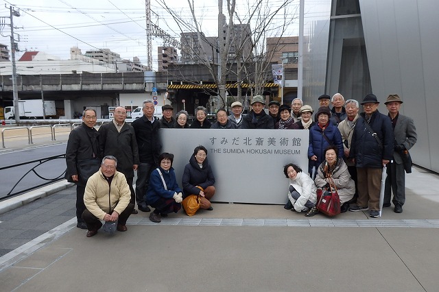 3月14日、どんより曇って寒い日。両国駅に24名が集合。バスで4つ目の停留場で下車、少し歩いて「すみだ北斎美術館」へ。 トイレタイムのあと、地下のロッカーでコートや鞄などを仕舞い身軽になって、2階へ。企画展示室では「世界の北斎」の作品やピーター・モースコレクション・楢崎コレクションに加え、墨田区が収集した優品を展示。4階には「常設展示室」があり、北斎とすみだとのかかわりや北斎の生涯の作品やタッチパネル式情報端末で楽しみながら理解を深める展示室がある。3時半まで自由に鑑賞。1階のミュージアムショップでお買い物をする方もあり、4時近くのバスで駅に向かう。小雨がパラパラ。日だまりには珍しいお天気。 両国駅近くの新しい街?土俵があって、いろいろなお店があって、甘いもの辛い物、お寿司などなど。二階の「源ちゃん」というお店で二次会。お店が変わるとお料理も変わって楽しい。いつものように楽しいひと時を過ごして7時近くに散会。どうやら5,6人が1階のお店「立ち飲み」に流れたよう・・・