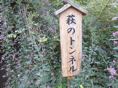 その後すぐ近くにある都立の文化財9庭園の一つの「向島百花園」行き、園内を秋の七草を見ながら散策しました(敬老週間のために入場料は無料)。記念撮影をした「萩のトンネル」は、季節を象徴し印象的でした。