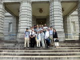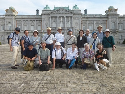 40分の見学を終えて退館、炎天下の現実に戻る。大きな噴水を中心に誂えた本館裏の主庭を一巡してから迎賓館玄関に場を移して集合写真を撮る。玄関から正門まで200メートル、日照りの一直線を歩き終えて、全員暑さにもめげず無事に迎賓館見学を終了する。