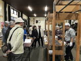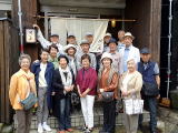 遠足気分でおしゃべりしているうちに下車駅の飯山駅に到着。駅からタクシーに分乗し、昼食場所「味蔵 月明かり」へ。途中、仏壇店が軒を連ねているが、気が付かずに到着。畳の部屋で、笹寿司や「えご」もある郷土料理に舌鼓をうつ。早速ビールで喉の乾きを潤す人も多い。昼食後は、隣接の「高橋まゆみ人形館」を見学する。