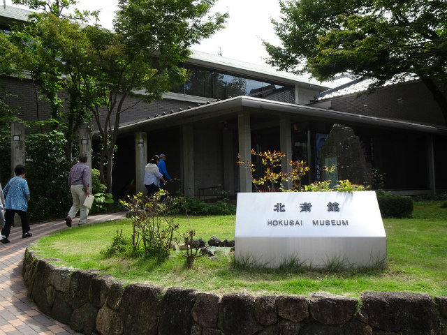 岩松院を出発、次は、「北斎館」。駐車場にマイクロバスを停め、北斎館に入る。北斎は83歳頃、初めて小布施を訪れ、都合4回、半年、1年近く当地に滞在したという。ちょうど「富嶽三十六景北斎VS富嶽百景北斎」の展示期間中で、一度に傑作を見られて幸運だった。肉筆画もあり、版画とは異なる繊細な筆致と色彩に魅了された。二基の色彩豊かな大きな祭屋台の豪華さには、驚かされた。北斎の世界から覚めると、すぐ側の「竹風堂」で昼食だ。この頃には、上天気になって、観光客も多い。名物「栗強(くりおこ)飯(わし)」の柳ごうりに包まれた山里定食を頂き、食事後、階下の土産物コーナーで栗羊羹などの買い物だ。