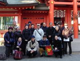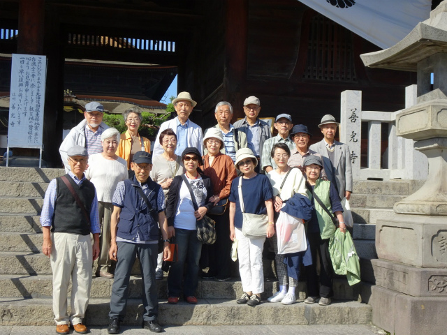 「山門」まで下り、集合時間を決め自由行動。仲見世通りを歩いて散策する。道の両側には宿坊を兼ねたお寺が並ぶ。「仁王門」を過ぎると土産物店、喫茶店、ホテルなどが並ぶ。関口さんご推薦の「八幡屋磯五郎」商店で、名物七味唐辛子の「七味ごま」を買い求めた。帰りに、ソフトクリームを味わいながら戻る。集合場所の「山門」を背景に集合写真を撮る。