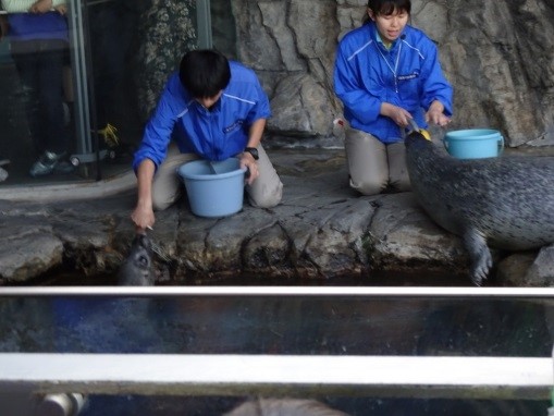 イルカShowのあと、アザラシShowをみる。よく訓練されていて、手をたたく(前ひれで腹をたたく)、笛をふく、輪投げ、輪くぐり、ジャンプ、ハロウイーンのカボチャをだいて写真用にポーズをとる、など熱演だった。Showが終った後みていたら、トレーナーが魚の餌を片手に、歩行・ポーズなどひとつづつ命令をだしては実行させている様子をみて、バックグラウンドではご苦労されているのだなと思った。
