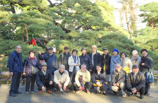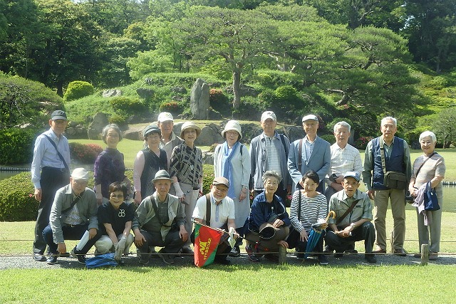 心配された天気は、午前中に降っていた雨も上がり観光日よりとなりました 新橋駅に午後2時30分集合、徒歩で浜離宮恩賜公園に向かう。恩賜公園は広くて全部回るには2~3時間かかりそうだが、時間があまりないので恩賜公園の中にある水上バス発着場まで一直線に向かう。途中三百年のクロマツがあり、太い枝が低く張り出し堂々たる姿を誇っている、その前で全員の集合写真をパチリ。