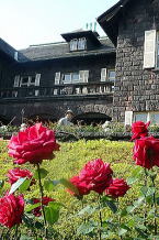 玄関から入ってホールにある大きな鏡、高い位置にあるので姿見ではなく明り取り用、鏡1枚で家が建つとか。食堂、客室など洋館の1階、2階、和館へと説明を聞いた。部屋ごとにある暖炉、金唐革紙の壁紙、天井の一枚板、ミントン製のタイル、特徴のある柱、そのほか贅沢なものに頷きため息ばかり。往時は3倍の敷地に20棟もの建物があったという。