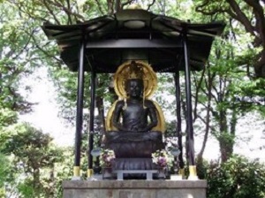 見事な山門をくぐると正面に男坂と称する厳しい石段が奥の院まで続きます。右に行くとなだらかな女坂の階段があります。三々五々好きな階段を使って奥の院へ、本堂には本尊「密教特有の尊格である明王の一尊」(不動明王・梵名アチャラナータ)が安置されています。皆は本堂の石段に並んで、お賽銭を投じながら不動明王にいろいろなお願いをしま した。本堂の周りは静かな庭になっており、庭を眺めながら本堂を1周できる回廊になっています。ちょうど本堂の真裏あたりに「大日如来坐像」が祀られています。これは天和3年(1683年)に鋳造された銅造であり、現在、区の有形文化財に指定されています。じっとお顔を眺めているだけで心が落ち着いてくるのが不思議です。