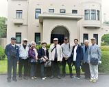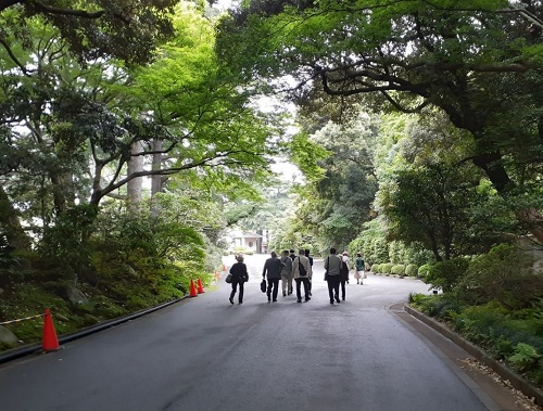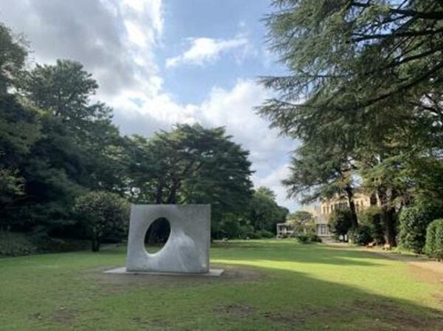 集合後、徒歩組とバス組に分かれて「庭園美術館」前で合流し、午前11時から見学を開始しました。あいにく当日の天気は曇り空でしたが、傘は差すこともなく実施することができました。