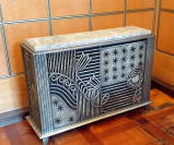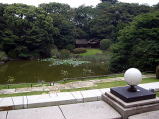 1Fは「ジャンル別展示」です。彫刻、漆工、刀剣、磁器、アイヌと琉球など。そろそろ疲れが出るころ、途中休憩室とベランダがありましたので外へ。建物の裏には庭園と茶室がありました。新鮮な空気を吸って見学再開です。