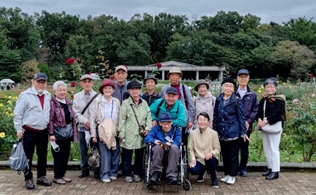 10月18日(火)清々しい秋の一日、懸案の「神代植物公園のバラと深大そば」の例会を実現した。午前11時、JR三鷹駅に15名の皆さんが集合、バスで神代植物公園へ。