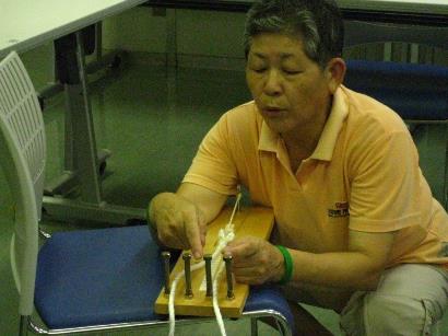 橘高先生の体操のあと、橘高先生の指導で、みんなで布ぞうりを作りま