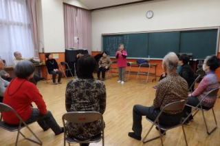 板倉宏子さんのピアノに合わせ、先ず発声の準備運動を行った。そのあと「100歳クラブのお餅つき」を二人一組で向かいあい、手拍子を打って、歌いながら行った。春の例会で披露する予定です。