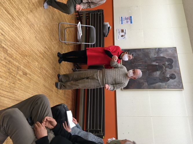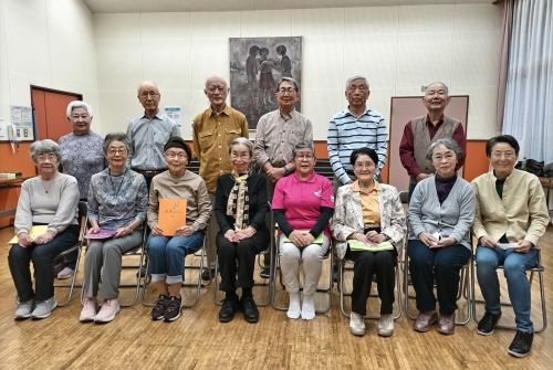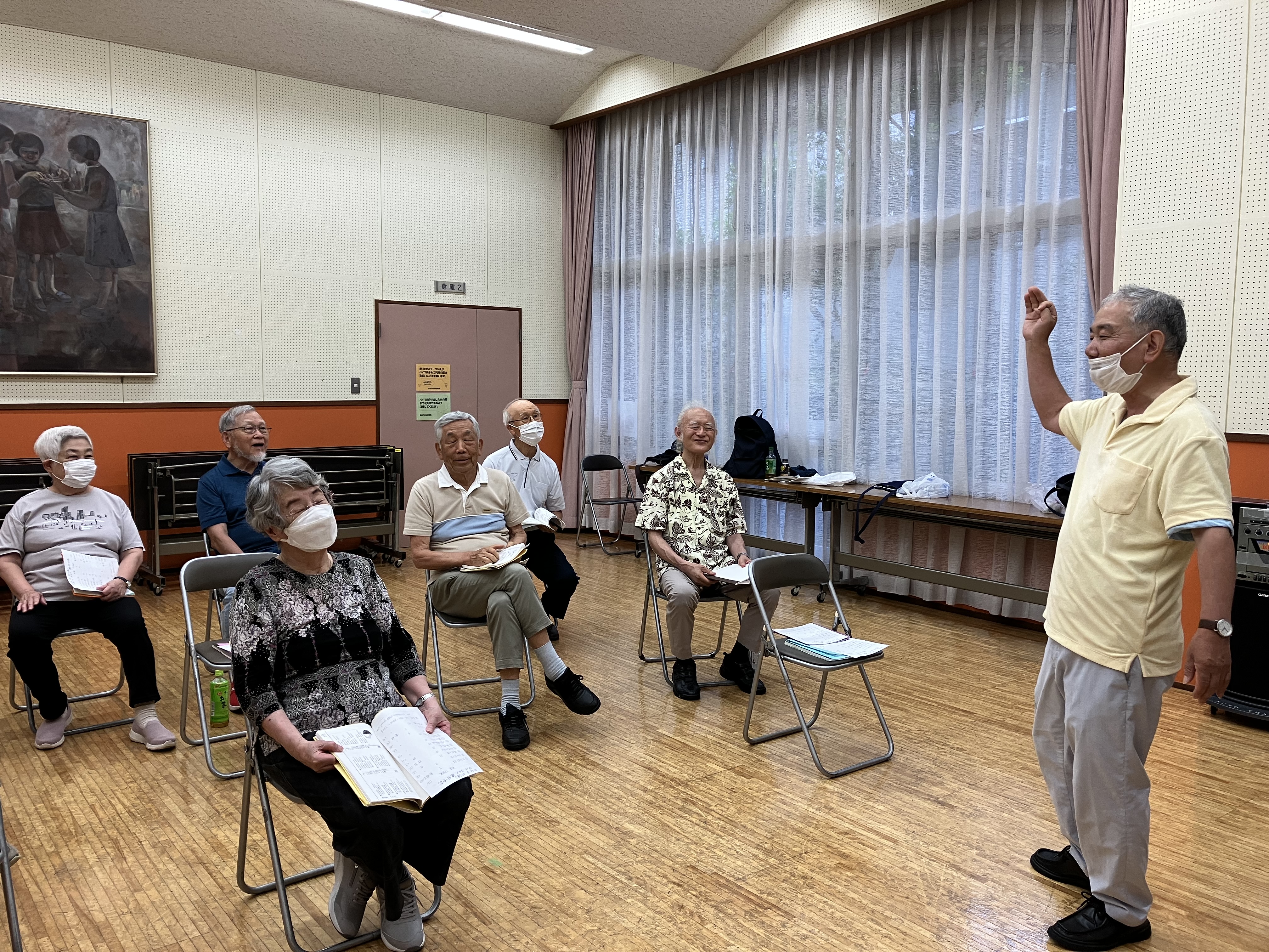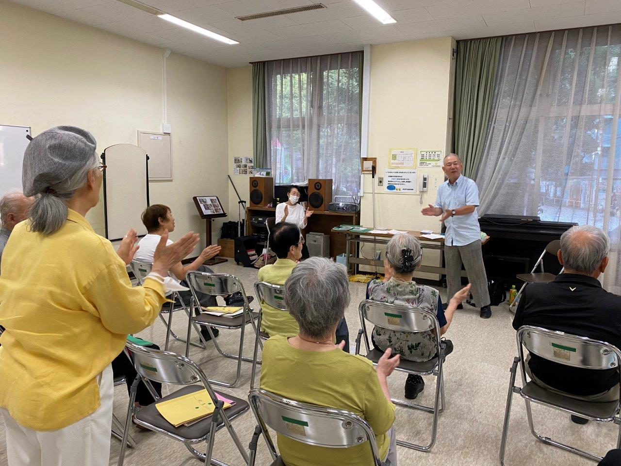 辻高志さんの「歌の時間」を楽しみました。参加者全員で集合写真(写真6)を撮りました。皆さんの顔が生き生きしています。以下に報告します。(喜田記)