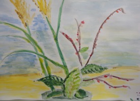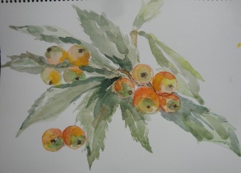 遠矢さんが自宅の庭から持参してくださった「たわわに実のついた枇杷の枝」「野の草花」、喜田さんが準備した「薔薇の花」と机の上に盛り沢山のモチーフが並びました。出席者は、思い思いに好きなものを描きました。3時間の集中した制作の後、皆で作品を合評して、この日の「サロン」を終了しました。