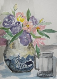 江戸切子のガラスの花瓶にトルコキキョウを一杯に活けて描きました。また、錫製のドイツのワイングラスと古めかしボトルを組合せて描いてみました。皆さんは描くたびに強い個性が画面に表現されて、本当に面白い作品が出来上がります。初心者も今ではクラブの中心になり、頼もしく楽しいサロンになりました。