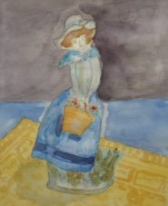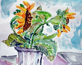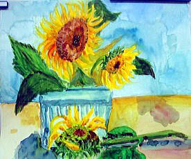 夏の花「ひまわり」を描きました。ご存知のように、最近の「ひまわり」は小さくておとなしいものが多いですね。そこで、東京郊外のあきる野市のひまわり畑から、昔ながらの雄々しい大きな「ひまわり」を3本、頂いてきました。その「ひまわり」を大きなバケツに投げ入れて、1本はバケツの外に投げ出して、面白い構図にしました。