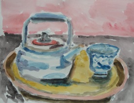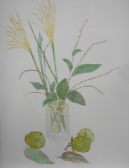 今回は世話人から「各自が描きたいものを持ち寄りましょう」とモチーフ持参を呼びかけました。各自が持ち寄ったものはいろいろと面白いものが有りました。遠矢さんは「秋の七草と葉山の海岸で拾った貝殻いろいろ」、黒田さんの「オーストリアの工芸品」、筒井さんは「スペイン・デアドロの人形」、竹前さんは「地元(長野県須坂)の大きなリンゴ」、喜田さん「自分愛用の帽子、やかんと茶碗」等でした。