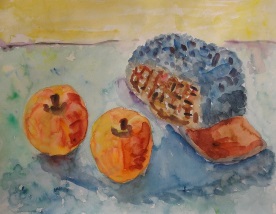 モチーフは竹前さんが持ってきてくださった「信州のリンゴ(赤と黄金)」それと、喜田さんが持ってきてくれた木製の「インド人形4点(笛吹き少年、太鼓たたき、馬に乗る少年、甕を抱えた少女)」を描きました。午後1時から4時30分までの3時間半、皆さん一生懸命制作しました。