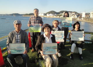 陽が少し傾き始め、遠くの富士山がパープ色の空気の中にかすみ始めたころにスケッチを終了。皆で出来上がった作品を持って記念写真を撮りました。(写真参照)