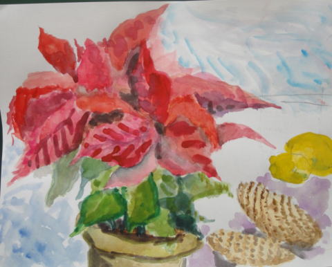 今月は8名が参加して、真っ赤な「ポンセチア」、紅葉した落ち葉、クリスマスグッズ等を思い思いに描きました。今回のテーマは「絵にアクセントをつける」「絵を強くする」でした。